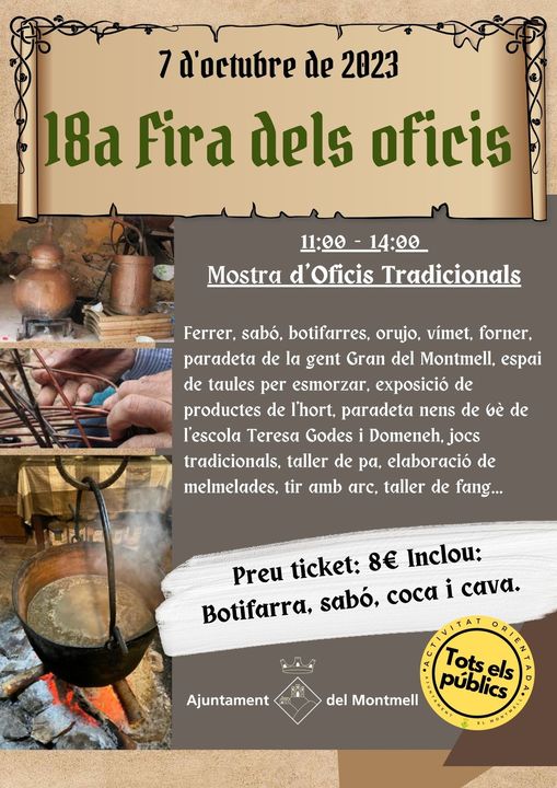 Com cada any al nostre municipi a l’octubre se celebra la Fira dels Oficis (mostra d’oficis tradicionals). Aquest serà la 18a edició i com sempre estarà ubicada a l’era de Cal Ventosa (darrera l’ajuntament) on es podrà veure l’elaboració de productes del porc, fer aiguardent, estris de vímet, sabó, carbó, melmelada, marge de pedra seca… Una petita mostra de vells oficis o activitats que avui ja gairebé no es fan. La jornada es clou amb la degustació d’alguns dels productes que hem vist fer al llarg del matí.