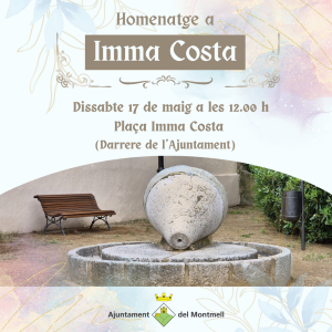 L’acte tindrà lloc el dissabte 17 de maig a les 12.00 a la plaça situada darrere de l’Ajuntament, que passarà a anomenar-se Plaça Imma Costa. Es tracta d’un gest simbòlic que vol fer valdre la tasca incansable d’Imma Costa, una figura clau en la història recent del municipi, molt estimada per veïns i veïnes.