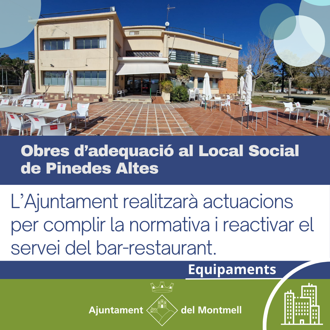 Des de l’Ajuntament del Montmell informem els veïns i veïnes que el Bar-Restaurant del Local Social de la urbanització Pinedes Altes es troba actualment tancat, després del cessament d’activitat de l’anterior adjudicatària el passat mes de setembre.