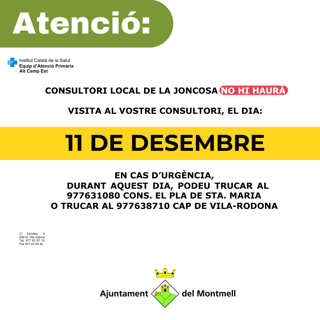 CONSULTORI LOCAL DE LA JONCOSA NO HI HAURÀ VISITA AL VOSTRE CONSULTORI, EL DIA: 11 DE DESEMBRE EN CAS D’URGÈNCIA, DURANT AQUEST DIA, PODEU TRUCAR AL 977631080 CONS. EL PLA DE STA. MARIA O TRUCAR AL 977638710 CAP DE VILA-RODONA Navegació d'entrades SERVEIS | BANCA MÒBIL